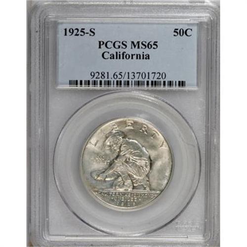 <B>1925-S 50C California MS65 PCGS.</B></I> Struck to mark the 75th anniversary of California's statehood, the coins display a kneeling "49er" on the obverse and a walking Grizzly bear on the reverse. This lustrous Gem example is mostly untoned and has few marks on either side. <BR><BR><b>Shipping:</b> Coins & Currency (<a target="_blank" href="http://www.heritageauctions.com/common/shipping.php">view shipping information</a>)