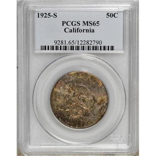 <B>1925-S 50C California MS65 PCGS.</B></I> Elements of peach, violet, crimson, claret, and silver-gray converge on this shining and delightful California half. Solidly struck and carefully preserved with wonderful visual appeal.<BR><BR><b>Shipping:</b> Coins & Currency (<a target="_blank" href="http://www.heritageauctions.com/common/shipping.php">view shipping information</a>)