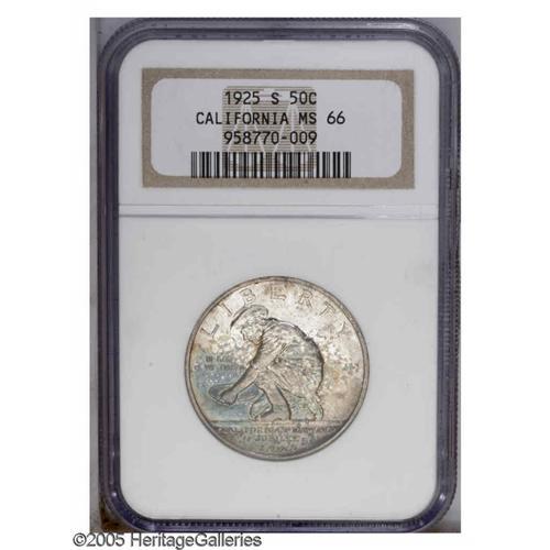 <B>1925-S<50C> California MS66 NGC.</B></I> Rich electric-blue and plum patina. An exquisitely struck and lustrous Gem that has beautifully preserved surfaces. The initial appearance of the grizzly bear on a commemorative; the San Diego and Bay Bridge types also feature the state animal.<BR><I>From The Clearfield Collection.</B></I>