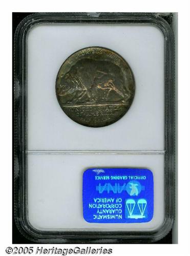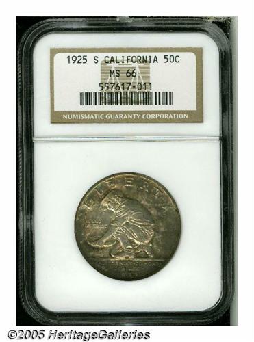 <B>1925-S<50C> California MS66 NGC.</B></I> Splendidly toned in waves of honey-gold, aqua, and cobalt-blue patina. A lustrous Gem that has seemingly pristine surfaces.