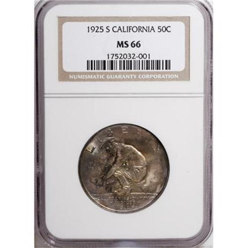 <B>1925-S 50C California MS66 NGC.</B></I> Radiantly lustrous surfaces display a melange of champagne-gold, lavender, and powder-blue toning. Beautifully preserved, and sharply struck devices.<BR><BR><b>Shipping:</b> Coins & Currency (<a target="_blank" href="http://www.heritageauctions.com/common/shipping.php">view shipping information</a>)