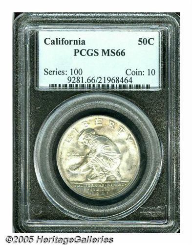 <B>1925-S<50C> California MS66 PCGS.</B></I> Blushes of apple-green and apricot color invigorate the peripheries. A lovely silver commemorative with booming luster and exquisite preservation.<BR><I>From The Clifford Columbus Collection.</B></I>