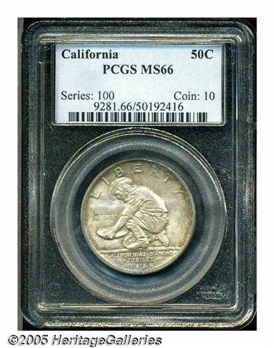 <B>1925-S<50C> California MS66 PCGS.</B></I> Lustrous surfaces are overlain by light gray and faint russet toning along with lime-green and cobalt-blue accents, and are nicely preserved. There are seemingly no significant contact marks over either side.