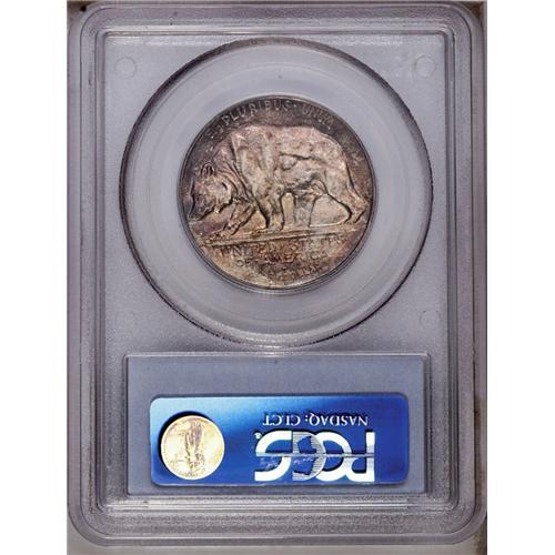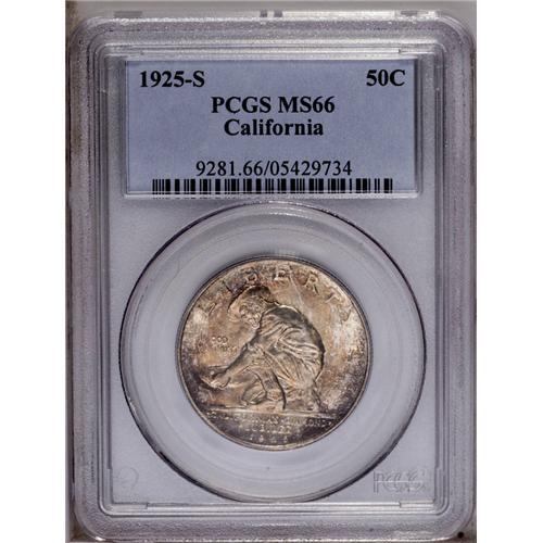 <B>1925-S<50C> California MS66 PCGS.</B></I> The rich multicolored toning that blankets each side of this lustrous Premium Gem features golden-brown, cobalt-blue, and maroon shades. Bright satiny luster, razor-sharp striking details, and near-pristine surfaces imply the MS66 grade designation. A lovely California commemorative half. <BR><BR><B>Important notice:</B> Heritage usually auctions material at the rate of 200-250 lots per hour. On some occasions eBay Live bid software or the Internet may not be able to keep up with the pace of the auction. We recommend placing a realistic absentee bid now as insurance to avoid disappointment. Occasionally the auctioneer may eliminate or reject an eBay Live bid, and the auctioneer may also reopen a lot after the close of the eBay live bidding (usually because we missed an audience bid), and may reject your bid even if it shows you as the winning bidder. By bidding via eBay Live, you agree that Heritage may award the lot to another bidder at its sole discretion under the circumstances described above or any other reasonable circumstances. Since eBay bids are not shown to us until we open the lot on the floor, we treat those bids just like floor bids. In most cases the floor responds before the eBay bid is presented to us, due to Internet lag time, so for consistency we have made it a policy that floor bids are always considered first over tie eBay live bids. Also please note that all Heritage lots purchased through eBay Live carry a 20% Buyer's Premium. Please make sure you read the Terms and Conditions before you bid. This lot is being auctioned in conjunction with a live floor auction by Heritage Galleries & Auctioneers. All final auction and invoice information will be supplied by Heritage Galleries & Auctioneers, and all other information should be considered preliminary. Lot:4900 <BR><BR><B>Winning Notification and Billing:</B> After the FINAL session in this auction is complete, Heritage will send e-mail and snail mail invoices. This process normally takes several days. All final auction and invoice information will be supplied by Heritage Galleries & Auctioneers, and all other information should be considered preliminary. <BR><BR>This auction will be conducted on a live auction floor and over the Internet through eBay Live. If you choose to place an absentee bid, please take a moment to <font color='#0000ff'><u><a href='http://pages.ebay.com/liveauctions/help/before/laabsentee.html'>learn how eBay Live absentee bidding works</a></u></font><font color='#000000'>