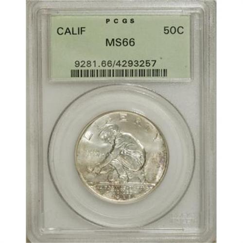 <B>1925-S 50C California MS66 PCGS.</B></I> A thoroughly lustrous and virtually unabraded Premium Gem. Plum-red and golden-brown freckles grace the lower obverse. Encased in a green label holder.<BR><BR><b>Shipping:</b> Coins & Currency (<a target="_blank" href="http://www.heritageauctions.com/common/shipping.php">view shipping information</a>)