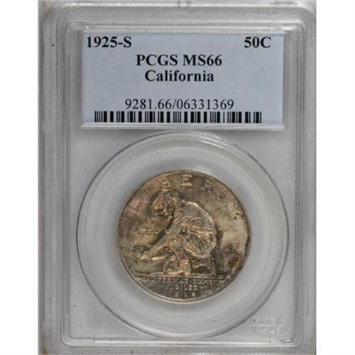 <B>1925-S 50C California MS66 PCGS.</B></I> Solidly struck with dappled reddish-orange and russet toning over shining silver-gray surfaces. This attractive Premium Gem is carefully preserved and free of distracting marks, a delightful California commemorative.<BR><BR><b>Shipping:</b> Coins & Currency (<a target="_blank" href="http://www.heritageauctions.com/common/shipping.php">view shipping information</a>)
