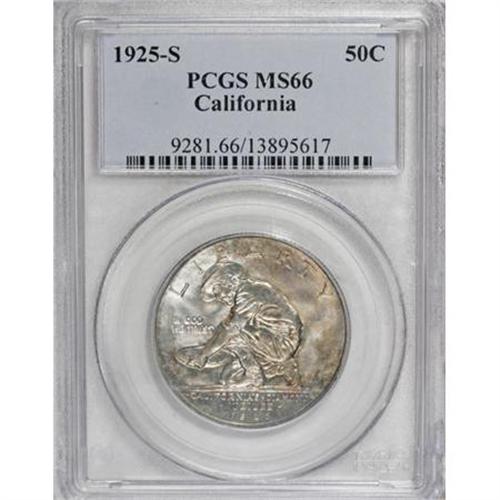 <B>1925-S 50C California MS66 PCGS.</B></I> PCGS Population (280/88). NGC Census: (351/146). Mintage: 86,394. Numismedia Wsl. Price for NGC/PCGS coin in MS66: $1,450. (#9281)<BR><BR><b>Shipping:</b> Coins & Currency (<a target="_blank" href="http://www.heritageauctions.com/common/shipping.php">view shipping information</a>)
