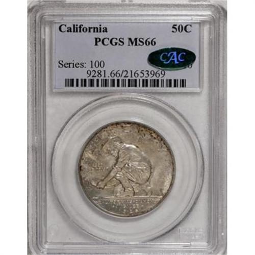 <B>1925-S 50C California MS66 PCGS.</B></I> A solidly struck example of this interesting commemorative issue. The surfaces show strong luster, and are toned in mottled russet-brown colors, and blushes of blue-green and lilac. There are no marks visible without careful inspection. Overall, this is a very collectible Premium Gem.<BR><I>From The Southwest Collection.</B></I><BR><BR><b>Shipping:</b> Coins & Currency (<a target="_blank" href="http://www.heritageauctions.com/common/shipping.php">view shipping information</a>)