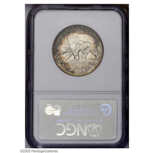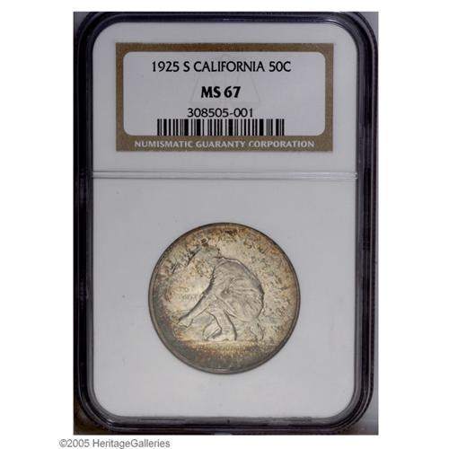 <B>1925-S<50C> California MS67 NGC.</B></I> A sensational Superb Gem example with satiny silver luster on both sides, accented by peripheral rose, blue, and iridescent toning. Sharply struck with nearly flawless fields and exceptional eye appeal. Population: 110 in 67, 8 finer (10/05).