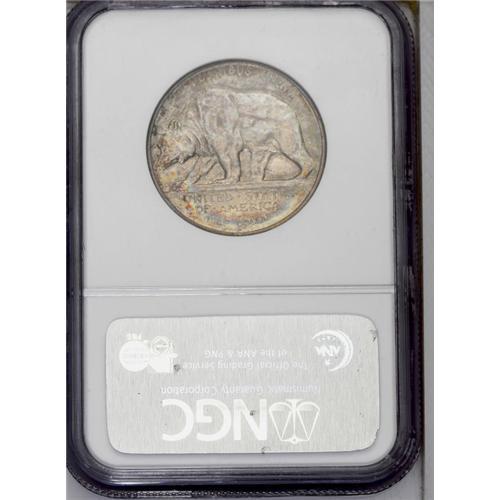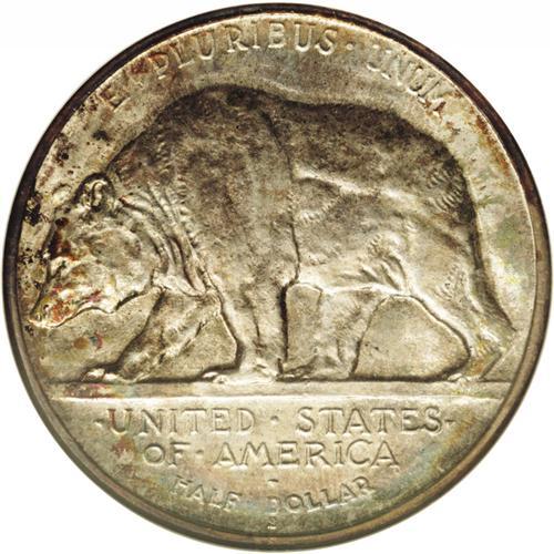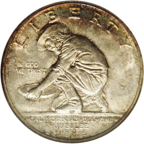 <B>1925-S<50C> California MS67 NGC.</B></I> Both sides exhibit a mottled, original toning scheme composed of various colors of gray, blue, and gold, red and green. Lustrous and well struck, with surfaces that are tantalizingly close to perfection. An outstanding candidate for a fine Commemorative collection. Census: 126 in 67, 11 finer (1/06).