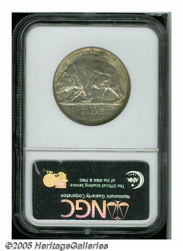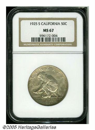 <B>1925-S<50C> California MS67 NGC.</B></I> Shimmering mint luster is veiled in delicate champagne-russet and silver-gray iridescence that is confined to both sides. The smooth, sharply impressed features are solidly graded at the MS67 level. Conditionally scarce. Population: 109 in 67, 11 finer (5/05).
