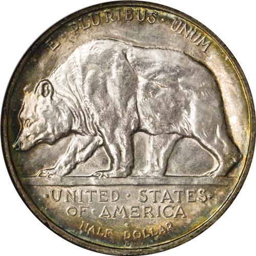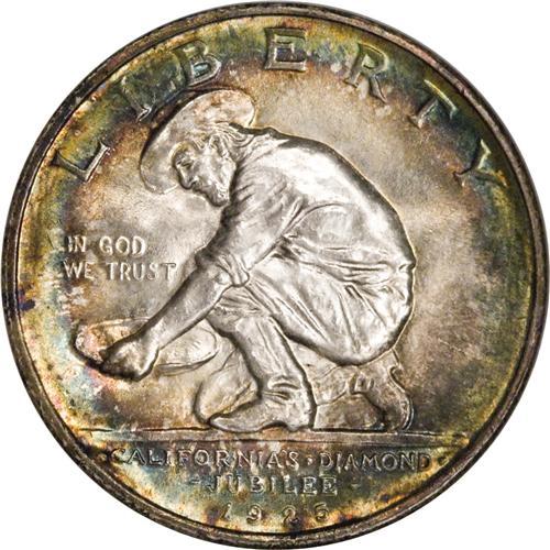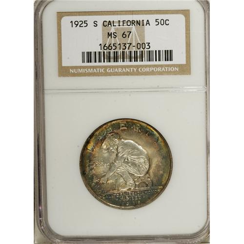 <B>1925-S 50C California MS67 NGC.</B></I> The California commemorative was the first to celebrate a 75th anniversary, a number that would later appear in association with the Gettysburg and Antietam issues. Greenish-gold, peach, and powder-blue patina graces the margins, while the centers retain their essential brilliance. NGC recognizes just 12 numerically finer examples, while PCGS notes only five (3/07).<BR><I>From The Cary & Cheryl Porter Collection.</B></I><BR><BR><b>Shipping:</b> Coins & Currency (<a target="_blank" href="http://www.heritageauctions.com/common/shipping.php">view shipping information</a>)