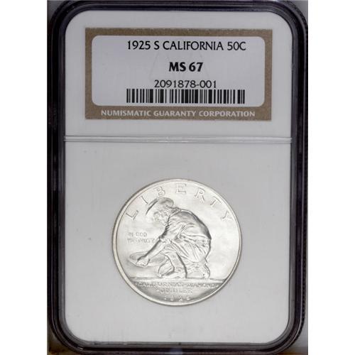 <B>1925-S 50C California MS67 NGC.</B></I> This is an amazing Superb Gem with brilliant silver surfaces and frosty luster. Both sides have pristine surfaces that are void of any meaningful contact marks. Among the finer examples that survive today; NGC has certified less than a dozen better pieces. Census: 123 in 67, 11 finer (1/06).