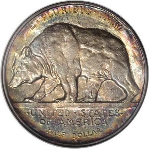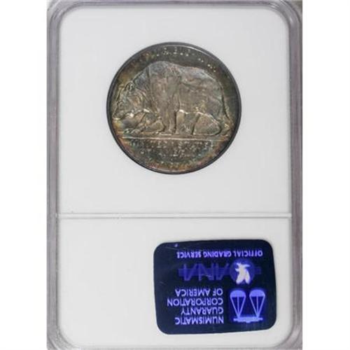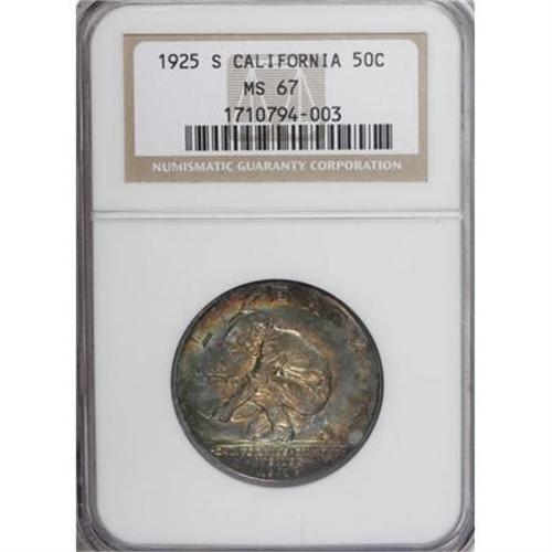 <B>1925-S 50C California MS67 NGC.</B></I> Ocean-blue, gold, and cherry-red dominate this lustrous and gorgeously preserved Superb Gem. The designs are fully impressed, and the eye appeal is unimprovable. The first of three appearances of a grizzly bear on classic commemorative types. As of (6/07), NGC has certified only 12 examples finer.<BR><I>From The Cary & Cheryl Porter Collection, Part Three.</B></I><BR><BR><b>Shipping:</b> Coins & Currency (<a target="_blank" href="http://www.heritageauctions.com/common/shipping.php">view shipping information</a>\)