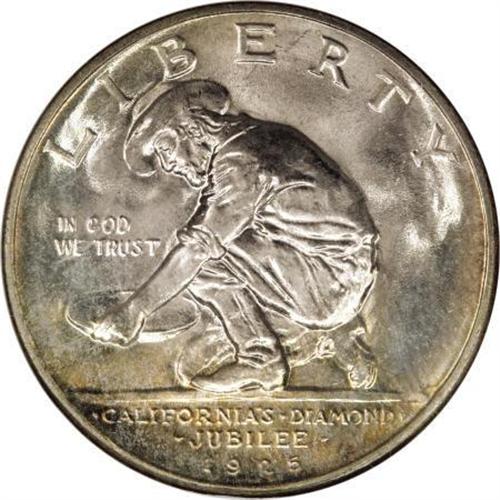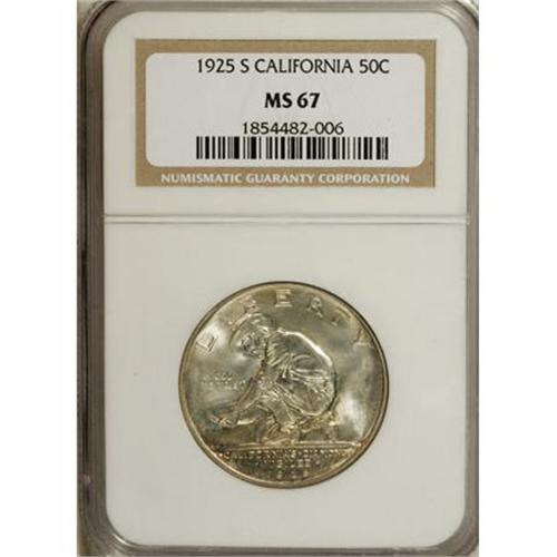<B>1925-S 50C California MS67 NGC.</B></I> The vibrant luster displayed by this Superb Gem has a semi-reflective glow and glimpses of orange and lavender toning at the borders lend considerable appeal to the otherwise untoned surfaces. A quality conscious silver commemorative collector should find this California Jubilee half to be a fine addition to their set.<BR><BR><b>Shipping:</b> Coins & Currency (<a target="_blank" href="http://www.heritageauctions.com/common/shipping.php">view shipping information</a>\)