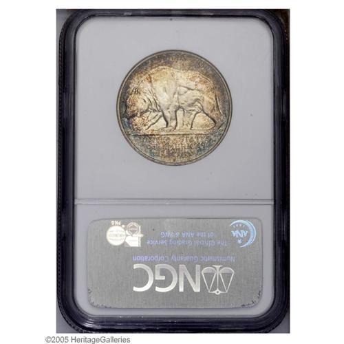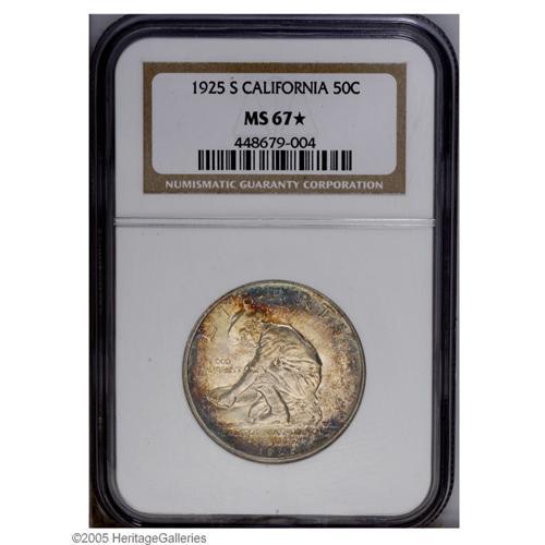 <B>1925-S<50C> California MS67 <S NGC.</B></I> A glorious and Superb Gem with brilliant satiny luster accented by splendid rainbow toning toward the borders. Few finer examples of this commemorative issue could possibly exist, despite some with higher numerical grades. The Star designation assigned by NGC assures the buyer of receiving exceptional quality. Population: 110 in 67, 8 finer (10/05).