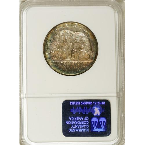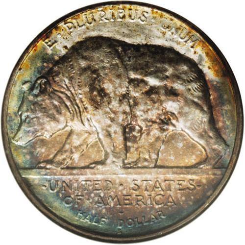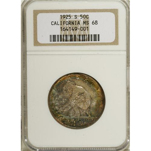 <B>1925-S 50C California MS68 NGC.</B></I> Lovely rainbow-hued target toning frames the lavender-gray center on the obverse. The reverse displays mottled champagne-apricot, electric-blue, and silver-gray shades. Crisply struck with ample satiny luster and immense visual appeal. A wonderful example of this early classic commemorative design, one that has received near-universal praise from numismatic aesthetes. Census: 8 in 68, 4 in 68 S, none finer (3/07).<BR><I>From The Cary & Cheryl Porter Collection.</B></I><BR><BR><b>Shipping:</b> Coins & Currency (<a target="_blank" href="http://www.heritageauctions.com/common/shipping.php">view shipping information</a>)