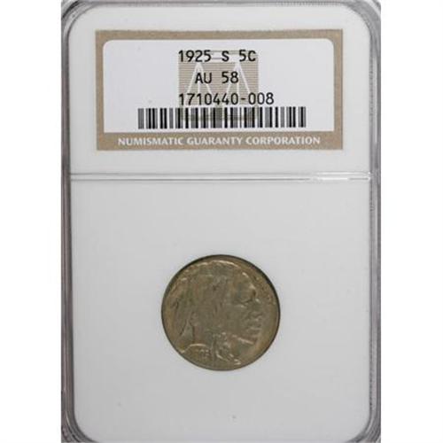 <B>1925-S 5C AU58 NGC.</B></I> NGC Census: (60/372). PCGS Population (71/496). Mintage: 6,256,000. Numismedia Wsl. Price for NGC/PCGS coin in AU58: $300. (#3956)<BR><BR><B>Coin Engraver:</B> James E. Fraser<BR><BR><b>Shipping:</b> Coins & Currency (<a target="_blank" href="http://www.heritageauctions.com/common/shipping.php">view shipping information</a>)