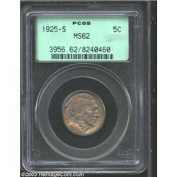 <TABLE cellSpacing=0 cellPadding=0 width="100%" bgColor=#000000 border=0><TBODY><TR><TD width="100%"><TABLE cellSpacing=1 cellPadding=3 width="100%" border=0><TBODY><TR><TD width="100%" bgColor=#79735c><FONT face=arial color=#ffffff size=3><B>Description</B> </FONT></TD></TR><TR><TD width="100%" bgColor=#ffffff><FONT face=arial size=2><B>1925-S 5C MS62 PCGS.</B></I> Splendid dove-gray, tan, and aqua colors endow this carefully preserved better date Nickel. Typically struck near the margins, but the centers have decent definition. A small mint-made lamination is noted on the bison below the M in UNUM. </FONT></TD></TR></TBODY></TABLE></TD></TR></TBODY></TABLE><BR><A name=PricesRealized></A><TABLE cellSpacing=0 cellPadding=0 width="100%" bgColor=#000000 border=0><TBODY><TR><TD width="100%"><TABLE cellSpacing=1 cellPadding=3 width="100%" border=0><TBODY><TR><TD width="100%" bgColor=#79735c><A name=PR><FONT face=arial color=#ffffff size=3><B>Previous Prices from Heritage Auctions</B> </FONT></A></TD></TR><TR><TD bgColor=#f6f6ed><TABLE cellSpacing=0 cellPadding=0 width="100%" border=1><TBODY><TR><TD align=middle width="33%"><B>Date</B></TD><TD align=middle width="33%"><B>Service</B></TD><TD align=middle width="33%"><B>Price</B></TD></TR><TR bgColor=whitesmoke><TD width="33%"><B>01/06/1996</B></TD><TD width="33%">PCGS</TD><TD width="33%">$330.00</TD></TR><TR bgColor=whitesmoke><TD width="33%"><B>05/03/2003</B></TD><TD width="33%">PCGS</TD><TD width="33%">$575.00</TD></TR></TBODY></TABLE></TD></TR><TR><TD bgColor=#ffffff><FONT face=arial size=1 ?>PLEASE NOTE: All prices realized reflect the final hammer price PLUS the buyer's premium in auctions that charge a buyer's premium. Each item has a notation at the top of the listing indicating whether that lot included a buyer's premium. Example: A item that sells with a final hammer price of $100 and a 20% buyer's premium will display with a price realized of $120. All information listed is intended to be as accurate as possible, but errors are possible. Please use this guide carefully and inform us of any inaccuracies. </FONT></TD></TR></TBODY></TABLE></TD></TR></TBODY></TABLE><BR><TABLE cellSpacing=0 cellPadding=0 width="100%" bgColor=#000000 border=0><TBODY><TR><TD width="100%"><TABLE cellSpacing=1 cellPadding=3 width="100%" border=0><TBODY><TR><TD width="100%" bgColor=#79735c colSpan=6><FONT face=arial color=#ffffff size=3><B>Price Guide*</B> </FONT></TD></TR><TR bgColor=#f6f6ed><TD align=middle><B>Grade</B> </TD><TD align=middle><B>Coin World<BR>(Trends)</B> </TD><TD align=middle><B>Numismedia<BR>Retail</B> </TD><TD align=middle><B>Numismedia<BR>Wholesale</B> </TD><TD align=middle><B>Coin<BR>Universe</B> </TD><TD align=middle><B>Heritage<BR>Value Index</B> </TD></TR><TR bgColor=#ffffff><TD align=middle>61</TD><TD align=right>---</TD><TD align=right>$575.00</TD><TD align=right>$479.00</TD><TD align=right>---</TD><TD align=right>$574.83</TD></TR><TR style="FONT-WEIGHT: bold" bgColor=#cccfdd><TD align=middle>62</TD><TD align=right>$875.00</TD><TD align=right>$870.00</TD><TD align=right>$725.00</TD><TD align=right>---</TD><TD align=right>$891.25</TD></TR><TR bgColor=#ffffff><TD align=middle>63</TD><TD align=right>$1,725.00</TD><TD align=right>---</TD><TD align=right>$1,575.00</TD><TD align=right>$2,100.00</TD><TD align=right>$1,324.13</TD></TR><TR bgColor=#ffffff><TD colSpan=6><FONT size=1>*All information listed is intended to be as accurate as possible, but errors are possible. No item may be returned or refused based on this information which is provided as a service to our customers. You should contact each pricing source directly to determine the accuracy of this information. </FONT></TD></TR></TBODY></TABLE></TD></TR></TBODY></TABLE><BR><TABLE cellSpacing=0 cellPadding=0 width="100%" bgColor=#000000 border=0><TBODY><TR><TD width="100%"><TABLE cellSpacing=1 cellPadding=3 width="100%" border=0><TBODY><TR><TD width="100%" bgColor=#79735c><FONT face=arial color=#ffffff size=3><B>Population Guide</B> </FONT></TD></TR><TR bgColor=#ffffff><TD align=middle><!-- Begin Output of Population Grid--><TABLE cellSpacing=0 cellPadding=0 width="100%" border=0><TBODY><TR><TD vAlign=center><TABLE cellSpacing=0 width="100%" border=1 cellsadding="3"><TBODY><TR><TD vAlign=center><TABLE cellSpacing=0 cellPadding=3 width="100%" border=1><TBODY><TR><TD vAlign=center align=middle bgColor=#f0f1e8 colSpan=2 <CENTER><FONT face=Arial size=2><B>PCGS Pop </B></FONT><CENTER></CENTER></TD><TD vAlign=center align=middle bgColor=#f0f1e8 colSpan=2><CENTER><FONT face=Arial size=2><B>NGC Pop</B></CENTER></FONT></TD></TR><TR><TD vAlign=center><FONT face=Arial size=2>(62)</FONT> </TD><TD vAlign=center align=right><FONT face=Arial size=2>41</FONT> </TD><TD vAlign=center><FONT face=Arial size=2>(62)</FONT> </TD><TD vAlign=center align=right><FONT face=Arial size=2>54</FONT> </TD></TR><TR><TD vAlign=center><FONT face=Arial size=2>(>62)</FONT> </TD><TD vAlign=center align=right><FONT face=Arial size=2>353</FONT> </TD><TD vAlign=center><FONT face=Arial size=2>(>62)</FONT> </TD><TD vAlign=center align=right><FONT face=Arial size=2>224</FONT> </TD></TR></TBODY></TABLE></TD></TR></TBODY></TABLE></TD></TR></TBODY></TABLE><!-- End Output of Population Grid--> Important notice: Heritage usually auctions material at the rate of 200-250 lots per hour. On some occasions eBay Live bid software or the Internet may not be able to keep up with the pace of the auction. We recommend placing a realistic absentee bid now as insurance to avoid disappointment. Occasionally the auctioneer may eliminate or reject an eBay Live bid, and the auctioneer may also reopen a lot after the close of the eBay live bidding (usually because we missed an audience bid), and may reject your bid even if it shows you as the winning bidder. By bidding via eBay Live, you agree that Heritage may award the lot to another bidder at its sole discretion under the circumstances described above or any other reasonable circumstances. Al