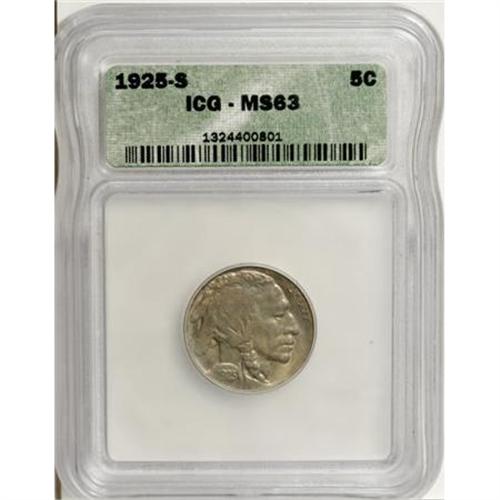 <B>1925-S 5C MS63 ICG.</B></I> Boldly struck with minor softness noted on 192 in the date, and on the bison's head. The cream-gray surfaces exhibit golden highlights, very few marks, and pleasing satin luster. <BR><BR><B>Coin Engraver:</B> James E. Fraser<BR><BR><b>Shipping:</b> Coins & Currency (<a target="_blank" href="http://www.heritageauctions.com/common/shipping.php">view shipping information</a>)