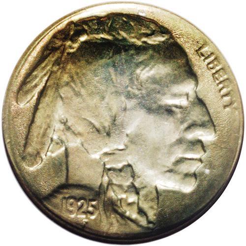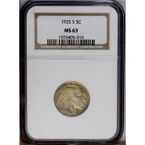<B>1925-S<5C> MS63 NGC.</B></I> David Lange's (1992) comment on this date that: "Extreme cases have distorted mntmarks..."could not be more true for this particular coin, as its mintmark is barely distinguishable. Lange also indicates that overall weakness is the norm for the issue. This piece displays weakness on the bison's head and tail, but is perhaps somewhat better struck than most specimens. Lustrous surfaces are lightly toned in green, gold, and lavender hues. <BR><BR><B>Important notice:</B> Heritage usually auctions material at the rate of 200-250 lots per hour. On some occasions eBay Live bid software or the Internet may not be able to keep up with the pace of the auction. We recommend placing a realistic absentee bid now as insurance to avoid disappointment. Occasionally the auctioneer may eliminate or reject an eBay Live bid, and the auctioneer may also reopen a lot after the close of the eBay live bidding (usually because we missed an audience bid), and may reject your bid even if it shows you as the winning bidder. By bidding via eBay Live, you agree that Heritage may award the lot to another bidder at its sole discretion under the circumstances described above or any other reasonable circumstances. Since eBay bids are not shown to us until we open the lot on the floor, we treat those bids just like floor bids. In most cases the floor responds before the eBay bid is presented to us, due to Internet lag time, so for consistency we have made it a policy that floor bids are always considered first over tie eBay live bids. Also please note that all Heritage lots purchased through eBay Live carry a 20% Buyer's Premium. Please make sure you read the Terms and Conditions before you bid. This lot is being auctioned in conjunction with a live floor auction by Heritage Galleries & Auctioneers. All final auction and invoice information will be supplied by Heritage Galleries & Auctioneers, and all other information should be considered preliminary. Lot:1087 <BR><BR><B>Winning Notification and Billing:</B> After the FINAL session in this auction is complete, Heritage will send e-mail and snail mail invoices. This process normally takes several days. All final auction and invoice information will be supplied by Heritage Galleries & Auctioneers, and all other information should be considered preliminary. <BR><BR>This auction will be conducted on a live auction floor and over the Internet through eBay Live. If you choose to place an absentee bid, please take a moment to <font color='#0000ff'><u><a href='http://pages.ebay.com/liveauctions/help/before/laabsentee.html'>learn how eBay Live absentee bidding works</a></u></font><font color='#000000'>