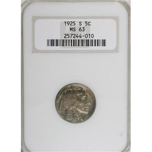 <B>1925-S 5C MS63 NGC.</B></I> Delicate gold and blue washes visit the nickel-gray surfaces of this luminous Select example. The strike is pleasing for the issue, if a trifle soft in the centers, and the overall visual appeal is strong.<BR><BR><B>Coin Engraver:</B> James E. Fraser<BR><BR><b>Shipping:</b> Coins & Currency (<a target="_blank" href="http://www.heritageauctions.com/common/shipping.php">view shipping information</a>)