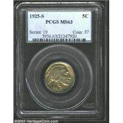 1925-S 5C MS63 PCGS. Golden-gray colors blanket both sides with the obverse being perhaps a little bit more vivid in shade. The features display uncommonly bold definition for a '25-S Nickel, and there are not many distracting bagmarks. Important notice: We expect to be auctioning lots at the rate of 200-250 per hour. On occasion eBay live bid software cannot keep up with the pace of the auctions where 4-5 lots per minute can hammer down, so we recommend that you place a realistic absentee bid now as insurance to avoid disappointment. Also please note that all Heritage/CAA lots purchased through eBay Live carry a 20% Buyer's Premium. Please make sure you read the Terms and Conditions.