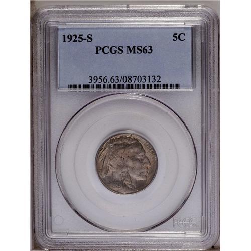 <B>1925-S<5C> MS63 PCGS.</B></I> Lustrous surfaces are visited by pastel rose and gold coloration, along with a few pepper-like toning spots scattered about. This issue is notoriously poorly struck, and this particular specimen displays softness in the 19 of the date, the Indian's hair, and the bison's hair, especially on the head. Both sides are devoid of significant abrasions. <BR><BR><B>Important notice:</B> Heritage usually auctions material at the rate of 200-250 lots per hour. On some occasions eBay Live bid software or the Internet may not be able to keep up with the pace of the auction. We recommend placing a realistic absentee bid now as insurance to avoid disappointment. Occasionally the auctioneer may eliminate or reject an eBay Live bid, and the auctioneer may also reopen a lot after the close of the eBay live bidding (usually because we missed an audience bid), and may reject your bid even if it shows you as the winning bidder. By bidding via eBay Live, you agree that Heritage may award the lot to another bidder at its sole discretion under the circumstances described above or any other reasonable circumstances. Since eBay bids are not shown to us until we open the lot on the floor, we treat those bids just like floor bids. In most cases the floor responds before the eBay bid is presented to us, due to Internet lag time, so for consistency we have made it a policy that floor bids are always considered first over tie eBay live bids. Also please note that all Heritage lots purchased through eBay Live carry a 20% Buyer's Premium. Please make sure you read the Terms and Conditions before you bid. This lot is being auctioned in conjunction with a live floor auction by Heritage Galleries & Auctioneers. All final auction and invoice information will be supplied by Heritage Galleries & Auctioneers, and all other information should be considered preliminary. Lot:1086 <BR><BR><B>Winning Notification and Billing:</B> After the FINAL session in this auction is complete, Heritage will send e-mail and snail mail invoices. This process normally takes several days. All final auction and invoice information will be supplied by Heritage Galleries & Auctioneers, and all other information should be considered preliminary. <BR><BR>This auction will be conducted on a live auction floor and over the Internet through eBay Live. If you choose to place an absentee bid, please take a moment to <font color='#0000ff'><u><a href='http://pages.ebay.com/liveauctions/help/before/laabsentee.html'>learn how eBay Live absentee bidding works</a></u></font><font color='#000000'>