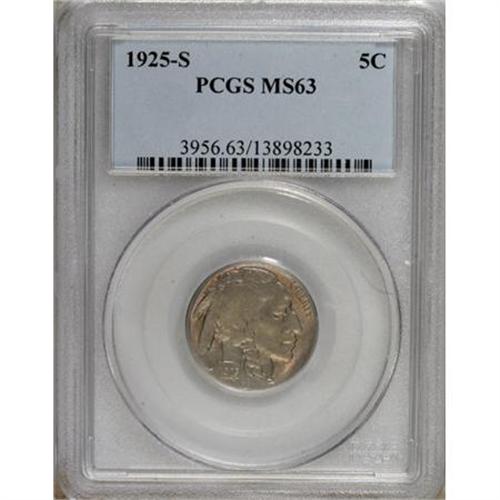 <B>1925-S 5C MS63 PCGS.</B></I> Pastel gold, blue, and lilac patina covers lustrous surfaces. Weakly struck in some areas, as typical for the issue. Devoid of mentionable marks.<BR><BR><b>Shipping:</b> Coins & Currency (<a target="_blank" href="http://www.heritageauctions.com/common/shipping.php">view shipping information</a>)