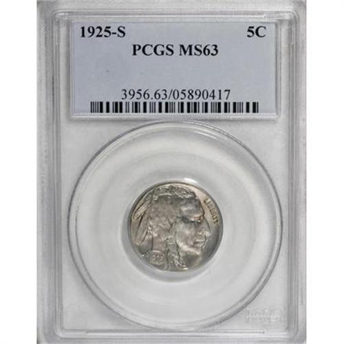<B>1925-S 5C MS63 PCGS.</B></I> High grade 1925-S Buffalo nickels are coveted as they are usually found weakly struck. The strike on this Select example is stronger than expected. The date is fully defined, while the bison's head lacks full definition. A few marks are seen, but they are not offensive and there is ample luster to appreciate.<BR><BR><B>Coin Engraver:</B> James E. Fraser<BR><BR><b>Shipping:</b> Coins & Currency (<a target="_blank" href="http://www.heritageauctions.com/common/shipping.php">view shipping information</a>)