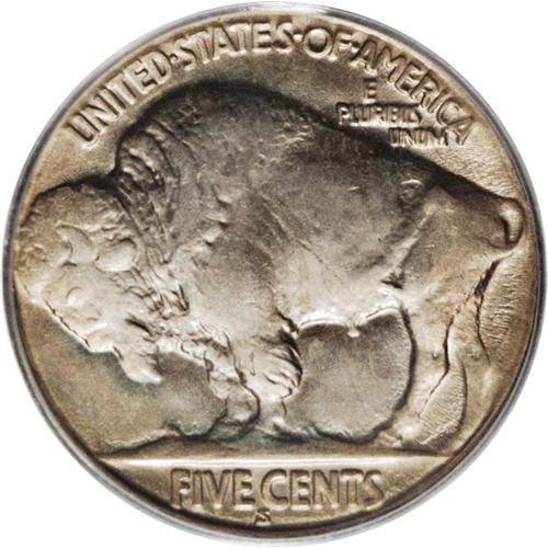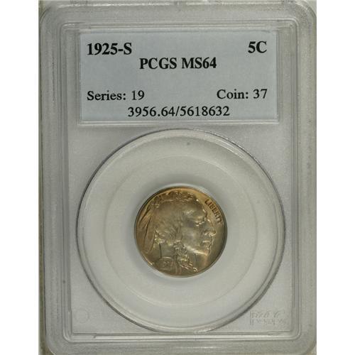 <B>1925-S 5C MS64 PCGS.</B></I> One of the well known strike rarities in the Buffalo nickel series, the '25-S is usually found with indistinct details. This piece is especially well defined, with the only notable softness located on the Indian's braid, and on the bison's head and tail. It is bright and satiny with uncommonly smooth surfaces, except for some heavy metal flow near the reverse periphery. Rainbow iridescence is prominent near the borders on each side. There is one noticeable blemish on the obverse, above the knot on the Indian's braid, and just a few minor nicks on the reverse. Population: 218 in 64, 18 finer (12/06).<BR><BR><b>Shipping:</b> Coin/Currency (<a target="_blank" href="http://www.heritageauctions.com/common/shipping.php">view shipping information</a>)