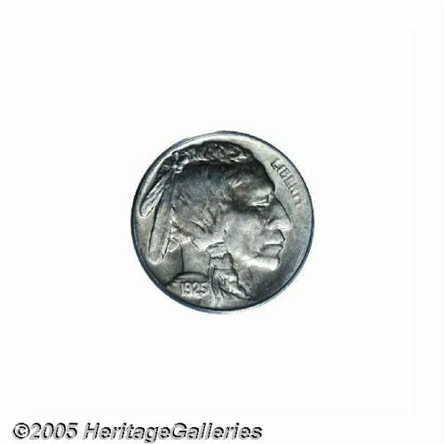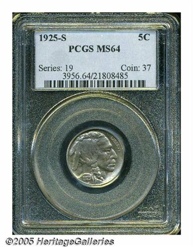 <B>1925-S<5C> MS64 PCGS.</B></I> This issue is notorious for weak strikes and lack-luster appearance. Of course, there is an exception to every rule, and the present coin is that exception. The surface have light nickel-gray color with frosty luster, and are accented by hints of gold toning. Although not a full strike, this example is more finely detailed than many, with only the tops of RTY in LIBERTY merged with the obverse border, and only a few reverse details merged with that border. A few tiny nicks on the reverse surface keep this from Gem quality. A lovely example for the connoisseur.
