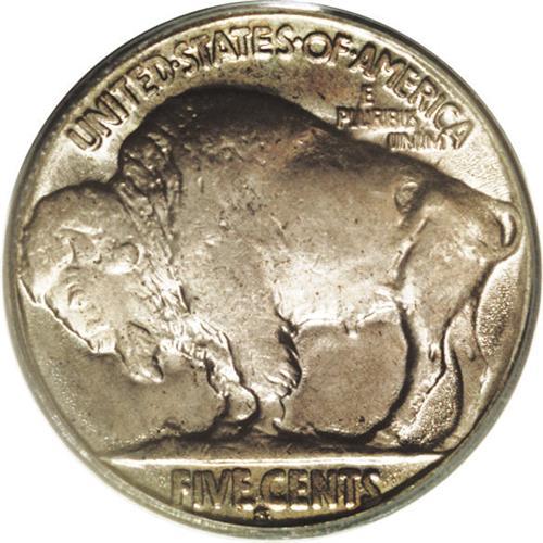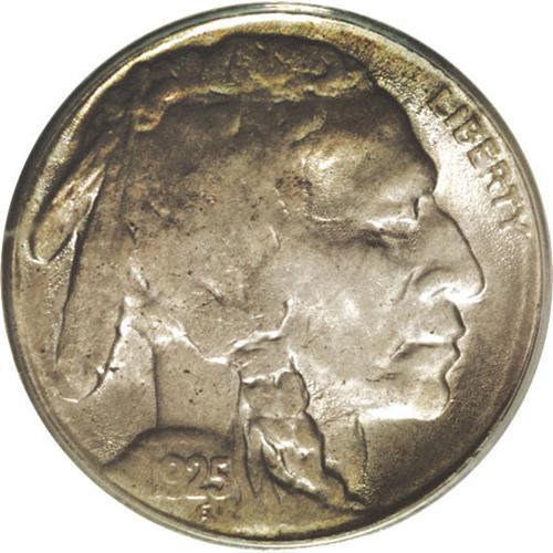 <B>1925-S<5C> MS64 PCGS.</B></I> While this piece is far from fully struck, it has a certain charm that many examples of this date lack. Perhaps it is the combination of strong satin-like luster and original blue-gray, rose, and golden patina that tend to overpower the striking deficiencies on this piece. The bison's forehead and some of the details on the Native American's braid are softly defined, as one would expect, but overall the coin is not completely mushy as often seen. A number of small carbon flecks prevent a higher grade along with the incompleteness of strike.