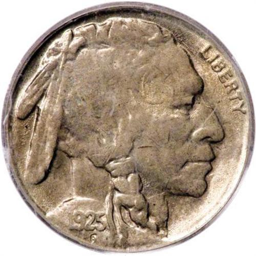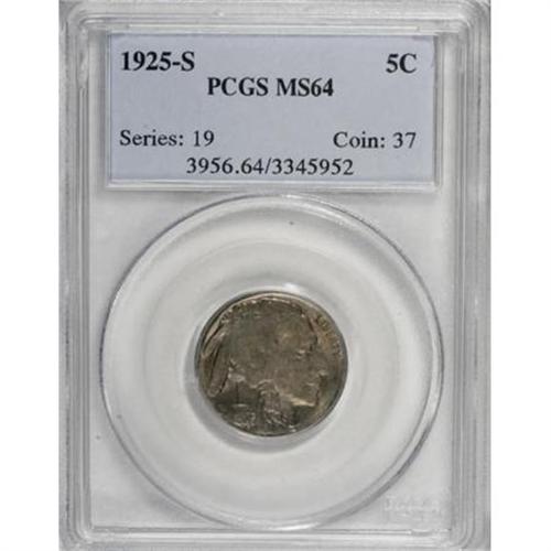 <B>1925-S 5C MS64 PCGS.</B></I> Fully lustrous beneath milky lilac-gray and golden patina, with a typically soft strike, especially in the hair on the bison's head. A few minute marks are undisturbing. Primarily because of the characteristic striking deficiency, Gem examples of the 1925-S are among the most difficult in the Buffalo nickel series. In this regard, PCGS has seen only 20 Gem-quality coins (8/07).<BR><BR><B>Coin Engraver:</B> James E. Fraser<BR><BR><b>Shipping:</b> Coins & Currency (<a target="_blank" href="http://www.heritageauctions.com/common/shipping.php">view shipping information</a>)