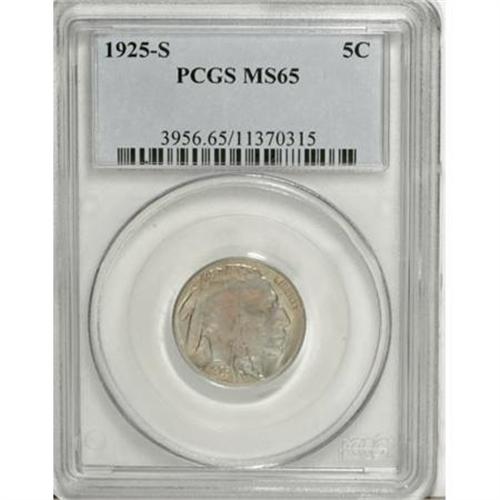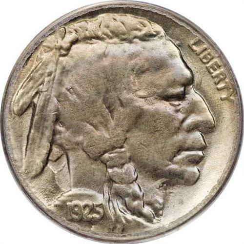 <B>1925-S 5C MS65 PCGS.</B></I> "In combination with their generally mushy appearance, the aesthetic value of this issue is low, regardless of its certified grade. Collectors, whatever their budget, buy this date simply to complete their sets." So Lange (2006) assessed the 1925-S nickel, perhaps the most pessimistic evaluation he gave to any issue. The collector who views this simply stellar Gem, however, has every reason to disagree with that statement as an absolute. Everything the typical example is, this wonderful coin is not.<BR> Both sides have similar intermingled shades of pastel rose at the center, framed by rings of light blue and pale gold. The satin surfaces are fully lustrous and enhanced by the attractive toning. Each side also exhibits light clash marks and the obverse displays prominent flow lines near the border, suggesting a late die state, although the reverse die appears to be quite fresh. The obverse strike is far above average with a bold LIBERTY that is fully separated from the border. Close examination reveals some disturbances in the holder that give the appearance of border roughness, although such is not the case on this piece. The reverse strike is full, practically unheard-of on a 1925-S Buffalo nickel. The bison's head details are fully defined, the tail is completely outlined and split over the hindquarter, and the mintmark is undeniably complete. Tied for the finest certified by either NGC or PCGS (7/07).<BR><BR><B>Coin Engraver:</B> James E. Fraser<BR><BR><b>Shipping:</b> Coins & Currency (<a target="_blank" href="http://www.heritageauctions.com/common/shipping.php">view shipping information</a>\)