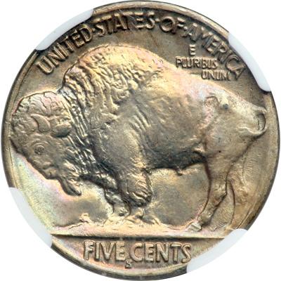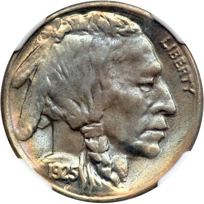 1925-S Buffalo Nickel. NGC graded MS-65. Lovely multicolor toning includes shimmering nickel-blue iridescence on either side. How else to describe what is a glistening gem of this extraordinarily elusive '25-S issue, a coin with luster that practically flies off the surface! The luster with the color enhances the unexpectedly beautiful eye appeal of the coin. Next we turn to describe the strike. And what we find is almost impossible to find on a 1925-S nickel: mathematically exact standards seen in the sharp centers, making this date noteworthy since "average" detail in the key high points (a catch-phrase for "miserable" or "as solid as pudding") is, sad to say, the norm. Expect a lot of competition here when bidding begins. Pop 22; 2 finer in 66.