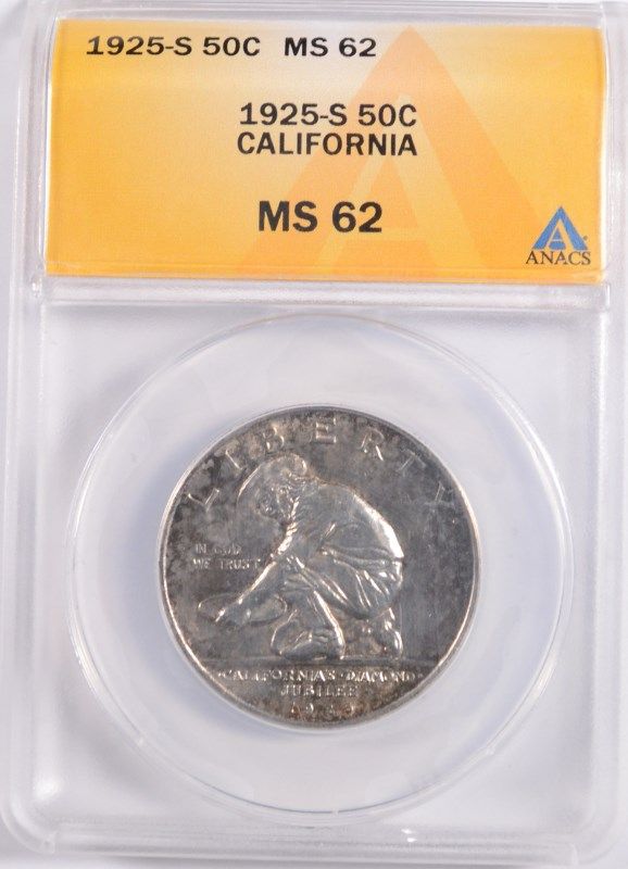 1925-S CALIFORNIA COMMEM HALF DOLLAR, ANACS MS-62 LOOKS BETTER BEAUTIFUL TONING