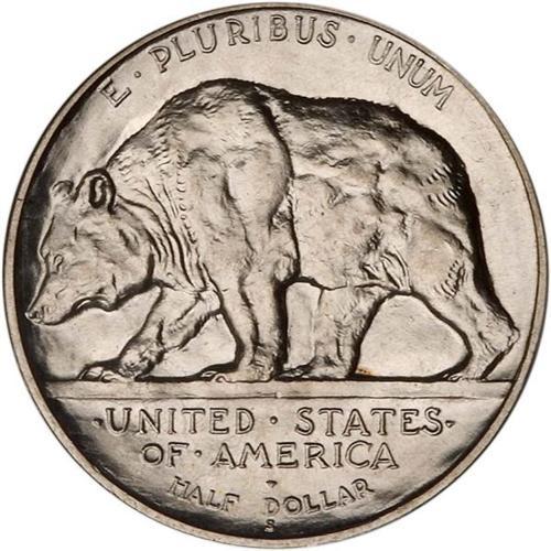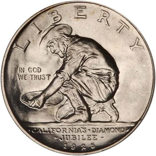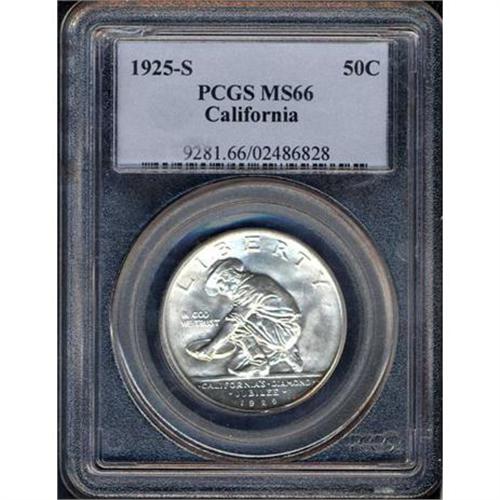 <b>1925-S California Half Dollar. PCGS graded MS66.</b> Dazzling, intensely lustrous surfaces are free from all but the most inconsequential blemishes and no toning. What's more, since the California Jubilee pieces tend to be well made, there is substantial detail to the highpoints on this outstanding example, including the shoulder area of the figure panning for gold <b>(PCGS # 9281)</b>