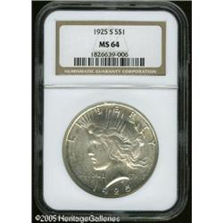 <B>1925-S<img border='0' src='http://www.heritagecoins.com/images/star.gif' width=10 height=10>$1 MS64 NGC.</B></I> Shimmering white luster with near-pristine surfaces. The strike is above average for the issue and only minor scrapes on the eagle's wings keep this appealing piece from a higher grade. Lot:10712