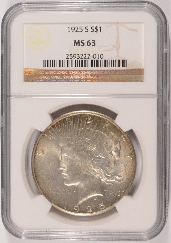 1925-S PEACE SILVER DOLLAR, NGC MS-63 NICE!!