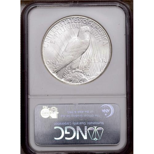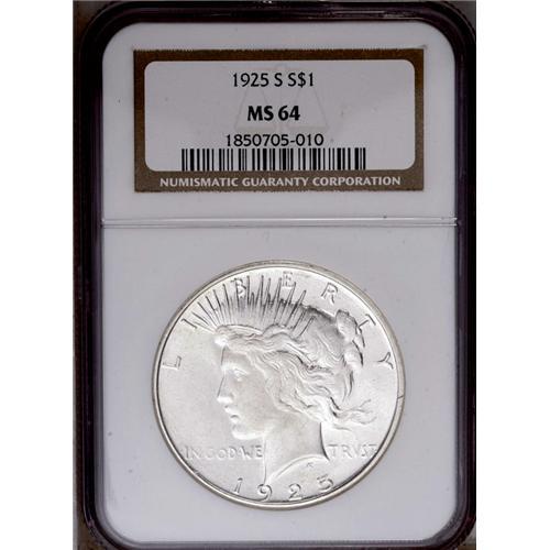 <B>1925-S<img border='0' src='http://www.heritagecoins.com/images/star.gif' width=10 height=10>$1> MS64 NGC.</B></I> Lustrous and well struck with pale silver-blue patina over the reverse. Some small abrasions on each side keep this piece from Gem status.