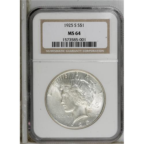 <B>1925-S S$1 MS64 NGC.</B></I> Near-brilliant surfaces display well struck design elements, except for the usual softness in the reverse center. Both sides possess good luster, and reveal fewer marks than ordinarily seen on representatives of this issue.<BR><BR><b>Shipping:</b> Coins & Currency (<a target="_blank" href="http://www.heritageauctions.com/common/shipping.php">view shipping information</a>)