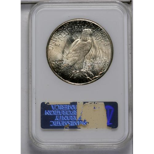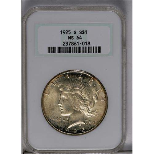 <B>1925-S<img border='0' src='http://www.heritagecoins.com/images/star.gif' width=10 height=10>$1> MS64 NGC.</B></I> A lustrous and lightly abraded S-mint dollar with reasonable central detail. The obverse has an orange-peel texture, as made. Blushes of violet and aquamarine toning are seen intermittently at the borders, while the centers are golden. In an older generation holder.