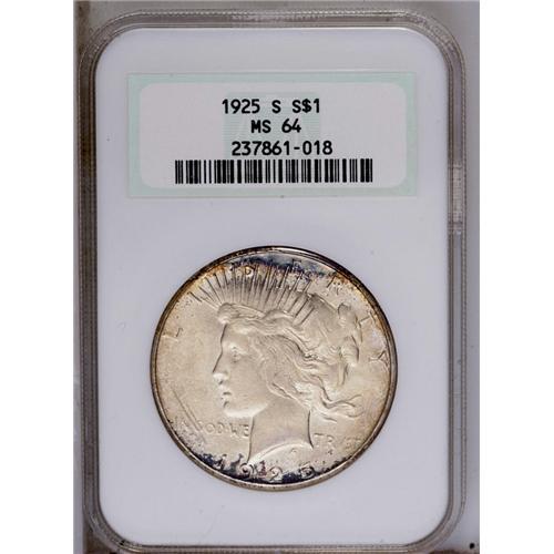 <B>1925-S<img border='0' src='http://www.heritagecoins.com/images/star.gif' width=10 height=10>$1> MS64 NGC.</B></I> Nicely struck for this conditionally challenging S-mint issue. The obverse has a matte-like texture, as made. Blushes of violet and aquamarine toning are seen intermittently at the borders. <BR><BR><B>Important notice:</B> Heritage usually auctions material at the rate of 200-250 lots per hour. On some occasions eBay Live bid software or the Internet may not be able to keep up with the pace of the auction. We recommend placing a realistic absentee bid now as insurance to avoid disappointment. Occasionally the auctioneer may eliminate or reject an eBay Live bid, and the auctioneer may also reopen a lot after the close of the eBay live bidding (usually because we missed an audience bid), and may reject your bid even if it shows you as the winning bidder. By bidding via eBay Live, you agree that Heritage may award the lot to another bidder at its sole discretion under the circumstances described above or any other reasonable circumstances. Since eBay bids are not shown to us until we open the lot on the floor, we treat those bids just like floor bids. In most cases the floor responds before the eBay bid is presented to us, due to Internet lag time, so for consistency we have made it a policy that floor bids are always considered first over tie eBay live bids. Also please note that all Heritage lots purchased through eBay Live carry a 20% Buyer's Premium. Please make sure you read the Terms and Conditions before you bid. This lot is being auctioned in conjunction with a live floor auction by Heritage Galleries & Auctioneers. All final auction and invoice information will be supplied by Heritage Galleries & Auctioneers, and all other information should be considered preliminary. Lot:3845 <BR><BR><B>Winning Notification and Billing:</B> After the FINAL session in this auction is complete, Heritage will send e-mail and snail mail invoices. This process normally takes several days. All final auction and invoice information will be supplied by Heritage Galleries & Auctioneers, and all other information should be considered preliminary. <BR><BR>This auction will be conducted on a live auction floor and over the Internet through eBay Live. If you choose to place an absentee bid, please take a moment to <font color='#0000ff'><u><a href='http://pages.ebay.com/liveauctions/help/before/laabsentee.html'>learn how eBay Live absentee bidding works</a></u></font><font color='#000000'>