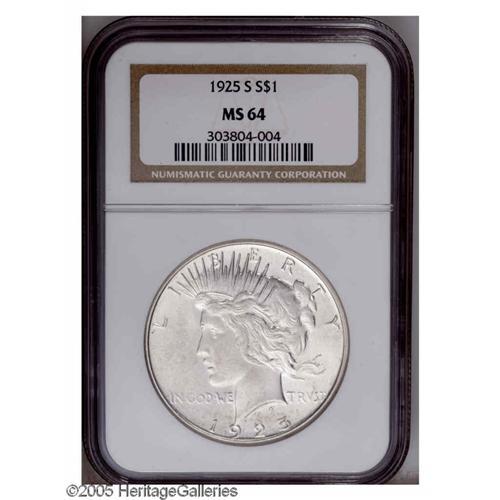 1925-S S$1 MS64 NGC. The bright, dynamically lustrous 1925-S[S$1] MS64 NGC.