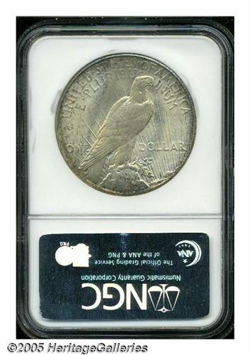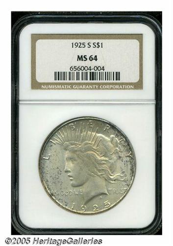 <B>1925-S<S$1> MS64 NGC.</B></I> Typically struck with lovely glowing luster that illuminates the lightly toned, carefully preserved surfaces of this near-Gem. Pale golden toning in the centers, and speckled purple and russet patina near the peripheries, are evident on both obverse and reverse. There are a couple of small milling marks, on Liberty's jaw, and an interesting planchet lamination (as struck), on the side of the eagle's neck, that leaves a shallow indentation. Only forty-four examples of this scarcer Peace dollar issue have been graded finer than MS64, by NGC, all of them at the MS65 grade level (5/05).
