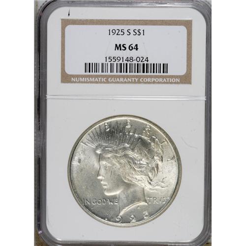 <B>1925-S S$1 MS64 NGC.</B></I> Whispers of faint light gold color reside on highly lustrous surfaces. Generally well impressed, save for the typical minor weakness on the reverse center. The grade is defined by a few minute marks.<BR><BR><b>Shipping:</b> Coins & Currency (<a target="_blank" href="http://www.heritageauctions.com/common/shipping.php">view shipping information</a>)