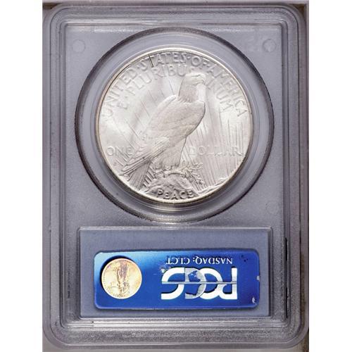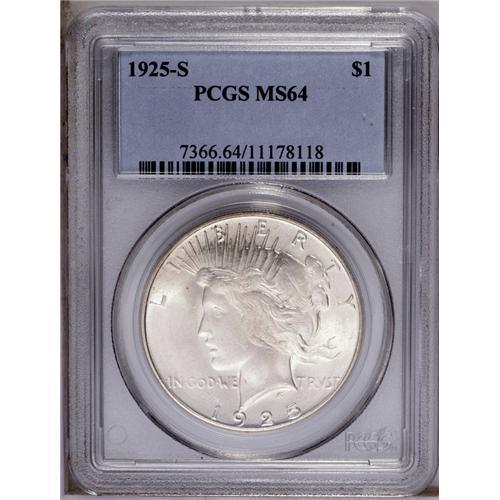 <B>1925-S<img border='0' src='http://www.heritagecoins.com/images/star.gif' width=10 height=10>$1> MS64 PCGS.</B></I> As available as this issue is in MS64 condition--the two major services have graded nearly 2,500 MS64 examples--it is equally elusive at the Gem level, with 80 pieces at both services (3/06). This near-Gem example has good luster and appealing surfaces, but a tick on Liberty's neck and a few small luster grazes, as well as a somewhat soft strike though the centers, limits the grade. <BR><BR><B>Important notice:</B> Heritage usually auctions material at the rate of 200-250 lots per hour. On some occasions eBay Live bid software or the Internet may not be able to keep up with the pace of the auction. We recommend placing a realistic absentee bid now as insurance to avoid disappointment. Occasionally the auctioneer may eliminate or reject an eBay Live bid, and the auctioneer may also reopen a lot after the close of the eBay live bidding (usually because we missed an audience bid), and may reject your bid even if it shows you as the winning bidder. By bidding via eBay Live, you agree that Heritage may award the lot to another bidder at its sole discretion under the circumstances described above or any other reasonable circumstances. Since eBay bids are not shown to us until we open the lot on the floor, we treat those bids just like floor bids. In most cases the floor responds before the eBay bid is presented to us, due to Internet lag time, so for consistency we have made it a policy that floor bids are always considered first over tie eBay live bids. Also please note that all Heritage lots purchased through eBay Live carry a 20% Buyer's Premium. Please make sure you read the Terms and Conditions before you bid. This lot is being auctioned in conjunction with a live floor auction by Heritage Galleries & Auctioneers. All final auction and invoice information will be supplied by Heritage Galleries & Auctioneers, and all other information should be considered preliminary. Lot:3847 <BR><BR><B>Winning Notification and Billing:</B> After the FINAL session in this auction is complete, Heritage will send e-mail and snail mail invoices. This process normally takes several days. All final auction and invoice information will be supplied by Heritage Galleries & Auctioneers, and all other information should be considered preliminary. <BR><BR>This auction will be conducted on a live auction floor and over the Internet through eBay Live. If you choose to place an absentee bid, please take a moment to <font color='#0000ff'><u><a href='http://pages.ebay.com/liveauctions/help/before/laabsentee.html'>learn how eBay Live absentee bidding works</a></u></font><font color='#000000'>