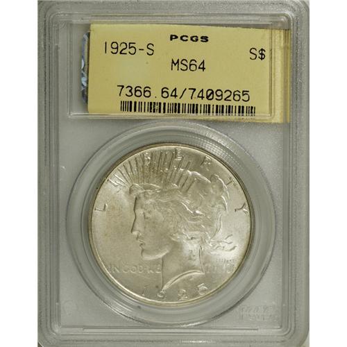 <B>1925-S S$1 MS64 PCGS.</B></I> Choice and frosty with pleasing silver-gray and ice-blue patina over each side. The strike is above-average, though a number of small marks combine to limit the grade.<BR><BR><b>Shipping:</b> Coins & Currency (<a target="_blank" href="http://www.heritageauctions.com/common/shipping.php">view shipping information</a>)