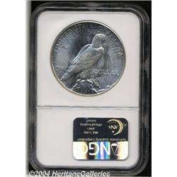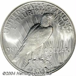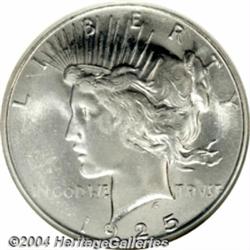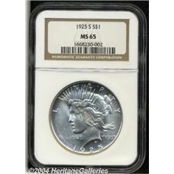 <B>1925-S<S$1> MS65 NGC.</B></I> The 1925-S is not as rare as the 1924-S in Mint State grades. At the Gem level, however, the 1925-S is the rarer issue and, in fact, it is the most difficult Peace Dollar to locate in MS65 along with the 1928-S. The typical '25-S is weakly struck and heavily marked, and thus Gems are virtually non-existent. Even dispersal of the vast Redfield holdings failed to bring any noticeable increase of Gems onto the market. This is a superior quality piece that has richly frosted mint luster and exceptionally clean surfaces. The strike, of course, is not complete, however, the details are uniformly and lightly impressed; meaning, that all of the design elements are present, just incompletely brought up. Brilliant overall without a hint of color. A superior 1925-S and one that would be difficult to improve upon. Population: 42 in 65, 0 finer (6/04). <BR><BR><B>Important notice:</B> Heritage usually auctions material at the rate of 200-250 lots per hour. On some occasions eBay Live bid software or the Internet may not be able to keep up with the pace of the auction. We recommend placing a realistic absentee bid now as insurance to avoid disappointment. Occasionally the auctioneer may eliminate or reject an eBay Live bid, and the auctioneer may also reopen a lot after the close of the eBay live bidding (usually because we missed an audience bid), and may reject your bid even if it shows you as the winning bidder. By bidding via eBay Live, you agree that Heritage may award the lot to another bidder at its sole discretion under the circumstances described above or any other reasonable circumstances. Since eBay bids are not shown to us until we open the lot on the floor, we treat those bids just like floor bids. In most cases the floor responds before the eBay bid is presented to us, due to Internet lag time, so for consistency we have made it a policy that floor bids are always considered first over tie eBay live bids. Also please note that all Heritage lots purchased through eBay Live carry a 20% Buyer's Premium. Please make sure you read the Terms and Conditions before you bid. </span></font></tr></table></td></tr></table>